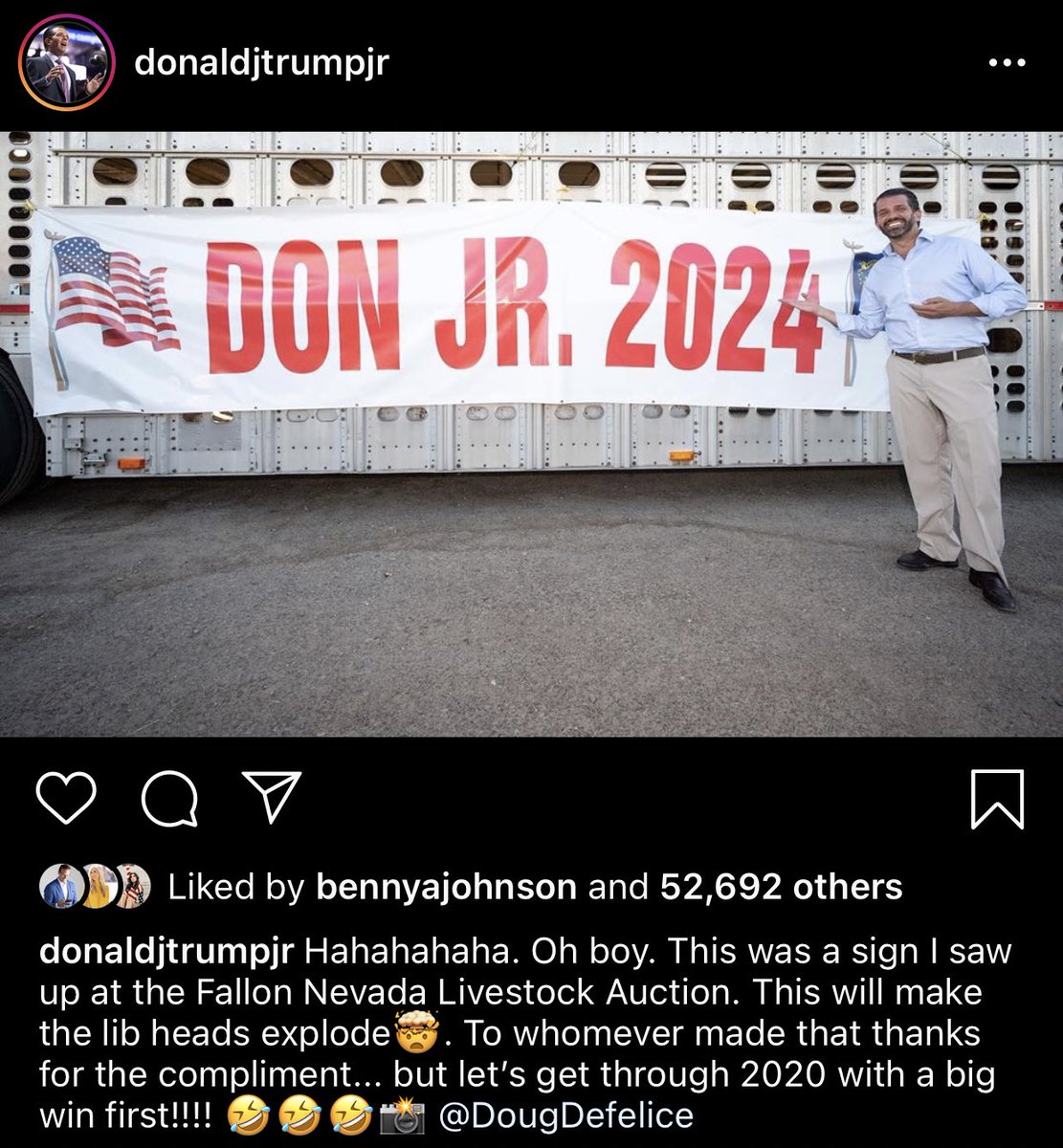 Trump Jr. dismisses speculation on 2024 presidential run ... : Donald Trump Jr Posed In Front Of A Don Jr 2024 Sign In Nevada On Saturday, Posted The Picture Online And Waited For The Lib Heads To Explode.