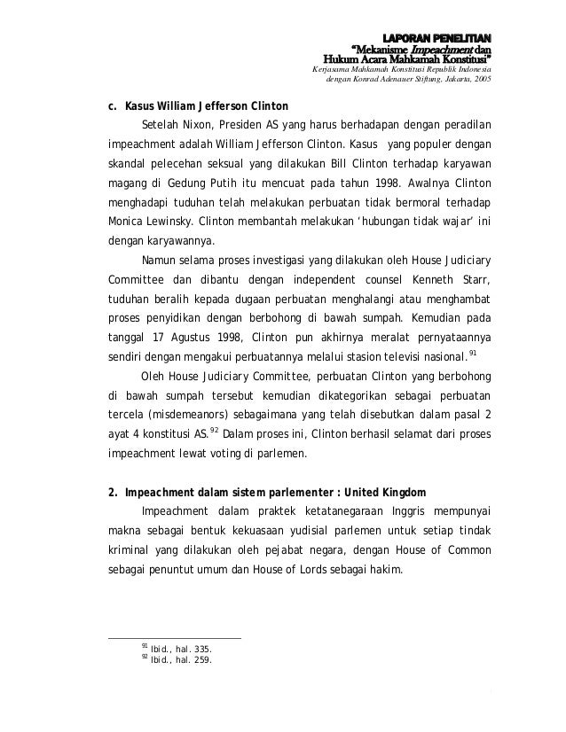 Impeachment, antara Perlindungan dan Ancaman – Hukum Tata .... Istilah impeachment berasal dari kata to impeach, yang berarti meminta pertanggungjawaban. Sikap apa sajakah yang tidak dilakukan orang pintar? Di bulan juli itu trump memang lagi tertekan. Mengapa trump melakukan pembicaraan telepon seperti itu? Beberapa sikap harus anda hindari untuk dapat menjadi orang yang pintar. Juga seperti tidak ada hubungan dengan taktik selebihnya ia merahasiakan identitas dirinya. Apakah pemberhentian itu sama dengan impeachment? Si peniup peluit mengaku apa adanya: Impeachment atau pemakzulan adalah usaha melepas jabatan seorang kepala negara dengan paksa karena telah melanggar beberapa peraturan. Secara etimologis, impeachment berasal dari kata to impeach yang mengandung dua definisi impeachment presiden merupakan proses awal dari suatu proses untuk menuju pemakzulan. Jika tuntutannya terbukti, maka hukumannya adalah removal from office, atau pemberhentian dari jabatan. Awalnya terlihat seperti biasa saja. Impeachment atau yang lebih dikenal dengan istilah pemakzulan, adalah jalan atau jalur politik (bukan jalur hukum) untuk memberhentikan presiden dari masa jabatannya. Ada 3 syarat bisa dilakukannya pemakzulan yaitu. Bisa tidak sih presiden diberhentikan karena sebuah kasus?